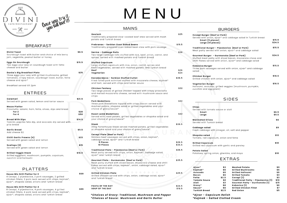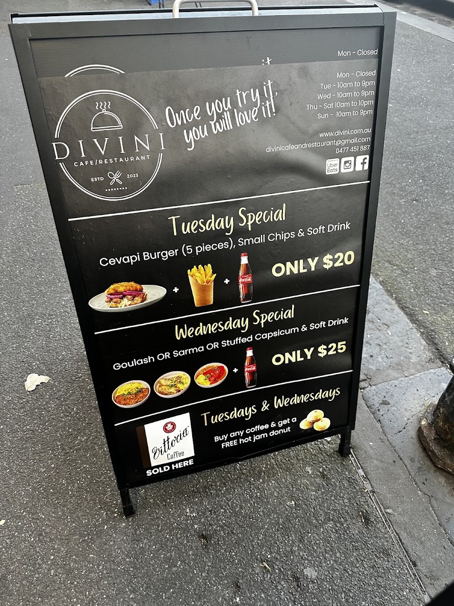 Introducing Divini Cafe & Restaurant, a culinary gem located at 155 Bay St, Port Melbourne, your destination for authentic Serbian cuisine. Here, the passion of owner Danka shines through every dish, from the rich Goulash and flavorful Cevapi Plate to the tender Pork Medallions and hearty Stuffed Capsicum. Each meal reflects a commitment to homemade quality, with fresh ingredients often sourced from Danka's own garden.